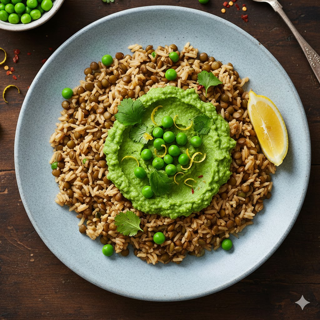 A nourishing, protein-rich vegetarian dish that combines earthy lentils and nutty wholegrain basmati rice with a vibrant, lemony pea topping.